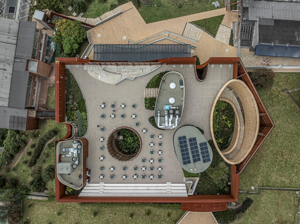 As a formal strategy, the project is conceived as a longitudinal prism: a metallic box perforated by circular caps that frame large windows for the various interior activities. The program integrates multipurpose rooms for meetings, exhibitions, and training, a bowling alley, a culinary classroom, a game room, restaurants, and an event space on the upper terrace, which also serves as a lookout toward the city and Bogotá's surrounding topography.