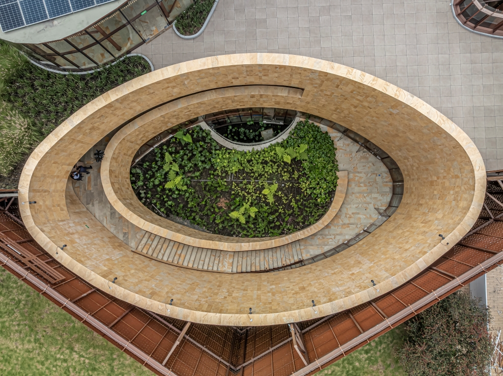 The spaces are organized around a sequence of circular, oval, and semicircular courtyards that provide natural light, ventilation, and spatial references throughout the interior path. The volume is wrapped in a Corten steel skin, perforated with lenticular openings of various sizes that filter light and grant the building a recognizable material identity.
