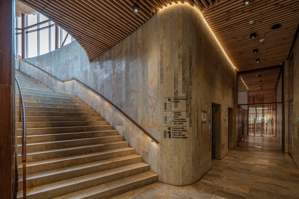 La atmósfera interior se matiza mediante el uso extensivo de madera en muros y cielorrasos, generando un ambiente cálido que contrasta con la piedra royal beta predominante en los pisos. Finalmente, el conjunto se complementa con una red sutil de caminos y un paisajismo robusto que integra el edificio al ecosistema del club y a la estructura ambiental de la ciudad.