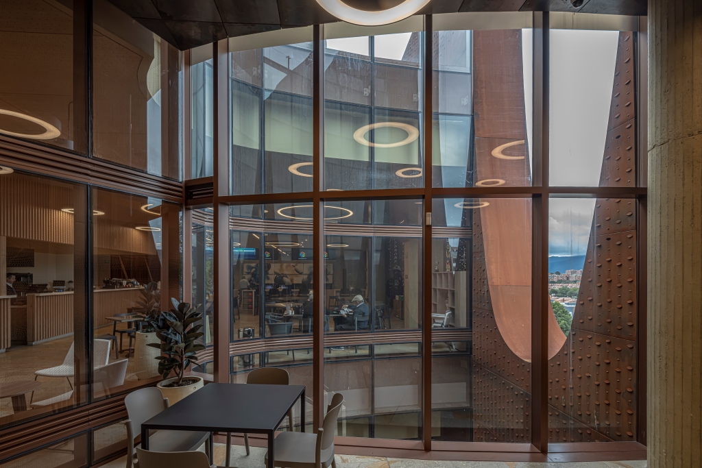 Como estrategia formal, el proyecto se concibe como un prisma longitudinal: una caja metálica perforada mediante casquetes circulares que enmarcan los grandes ventanales de las distintas actividades interiores. El programa integra salones polivalentes para reuniones, exhibiciones y formación, bolera, aula de gastronomía, sala de juegos, restaurantes y un espacio para eventos en la terraza superior, concebida además como mirador hacia la ciudad y la topografía circundante de Bogotá.