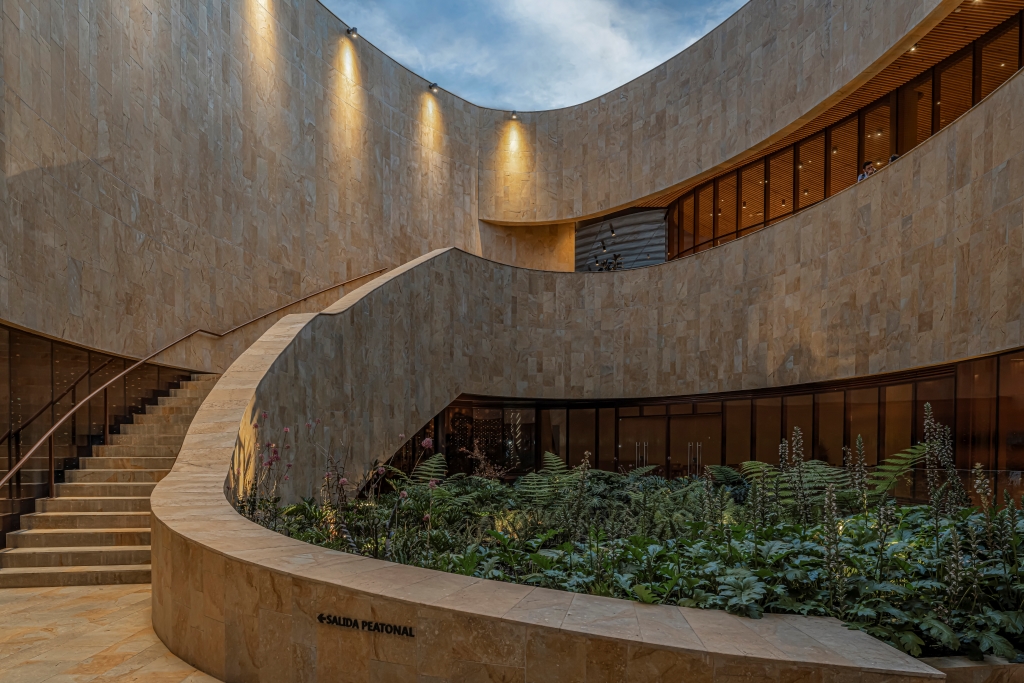 Los espacios se organizan alrededor de una secuencia de patios de geometría circular, ovalada y semicircular, que aportan luz natural, ventilación y referencias espaciales al recorrido interior. El volumen se envuelve con una piel metálica en acero corten, perforada con aperturas de distintos tamaños y de formas lenticulares, que filtran la luz y dotan al edificio de una identidad material reconocible.