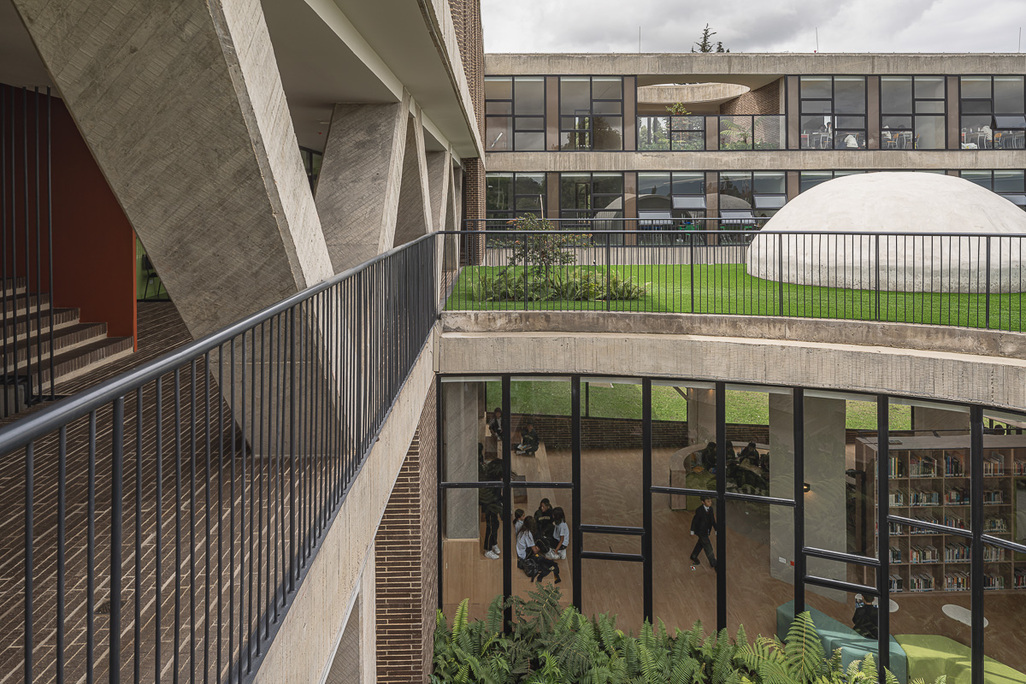 The IB Block of the Gimnasio Hontanar is configured as an L-shaped linear volume, articulated through an artificial topography that houses the library and whose roof functions as an accessible green platform. Above it, truncated spherical skylights are arranged to ensure the entry of zenithal natural light and to provide a distinctive formal identity to the complex.