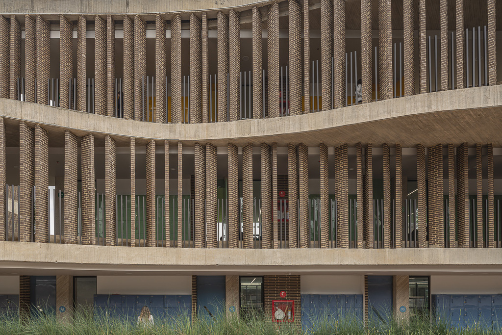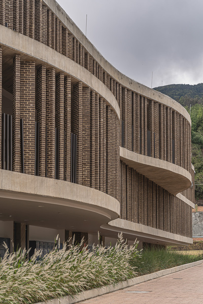 El sistema material combina estructura en concreto a la vista con revestimiento en ladrillo de gran formato en tono chocolate para fachadas y circulaciones. En los espacios interiores predomina una paleta en tonalidades blancas, complementada con acentos cromáticos en carpinterías y mobiliario fijo, lo que favorece la claridad visual y la neutralidad ambiental requeridas para el uso académico.