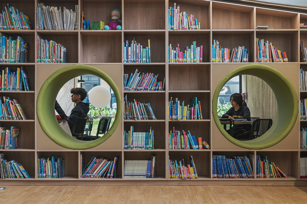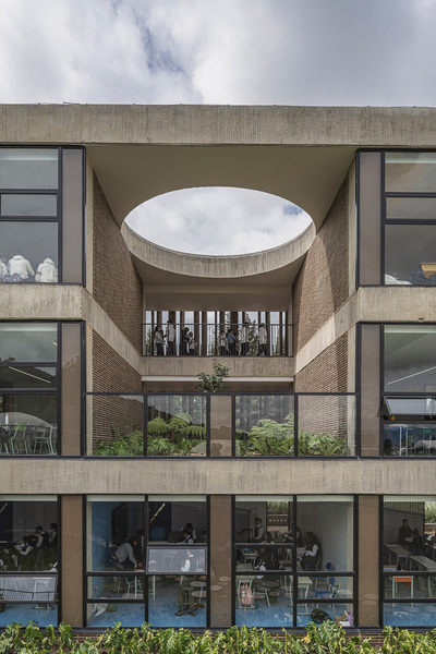 The building’s volumetry is based on a controlled alternation of solids and voids: collective gathering areas, vertical and horizontal circulation spaces, and garden terraces. These elements produce a rhythmic façade reading, contrasting with large glazed panels that optimize natural light intake in the directed-learning spaces.